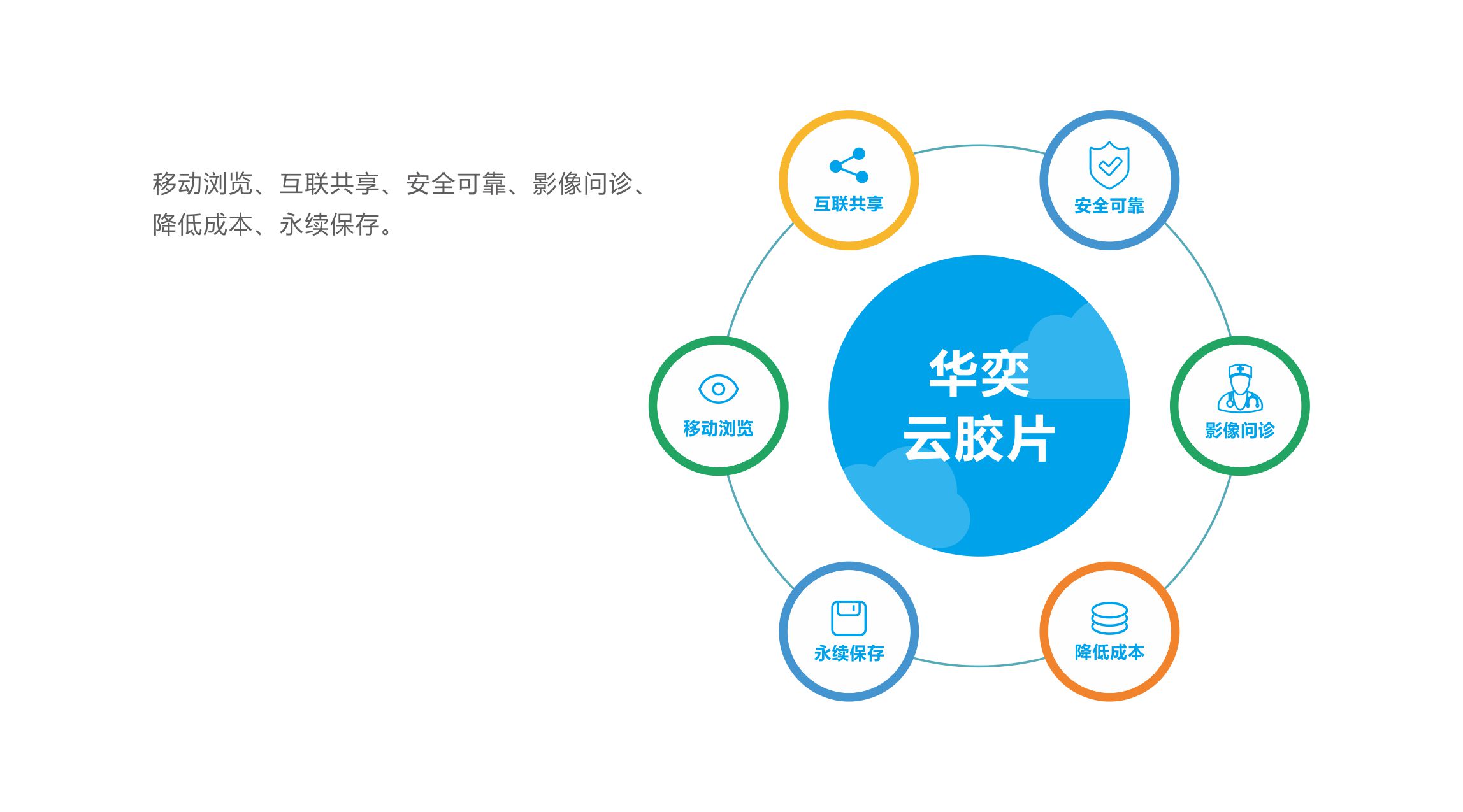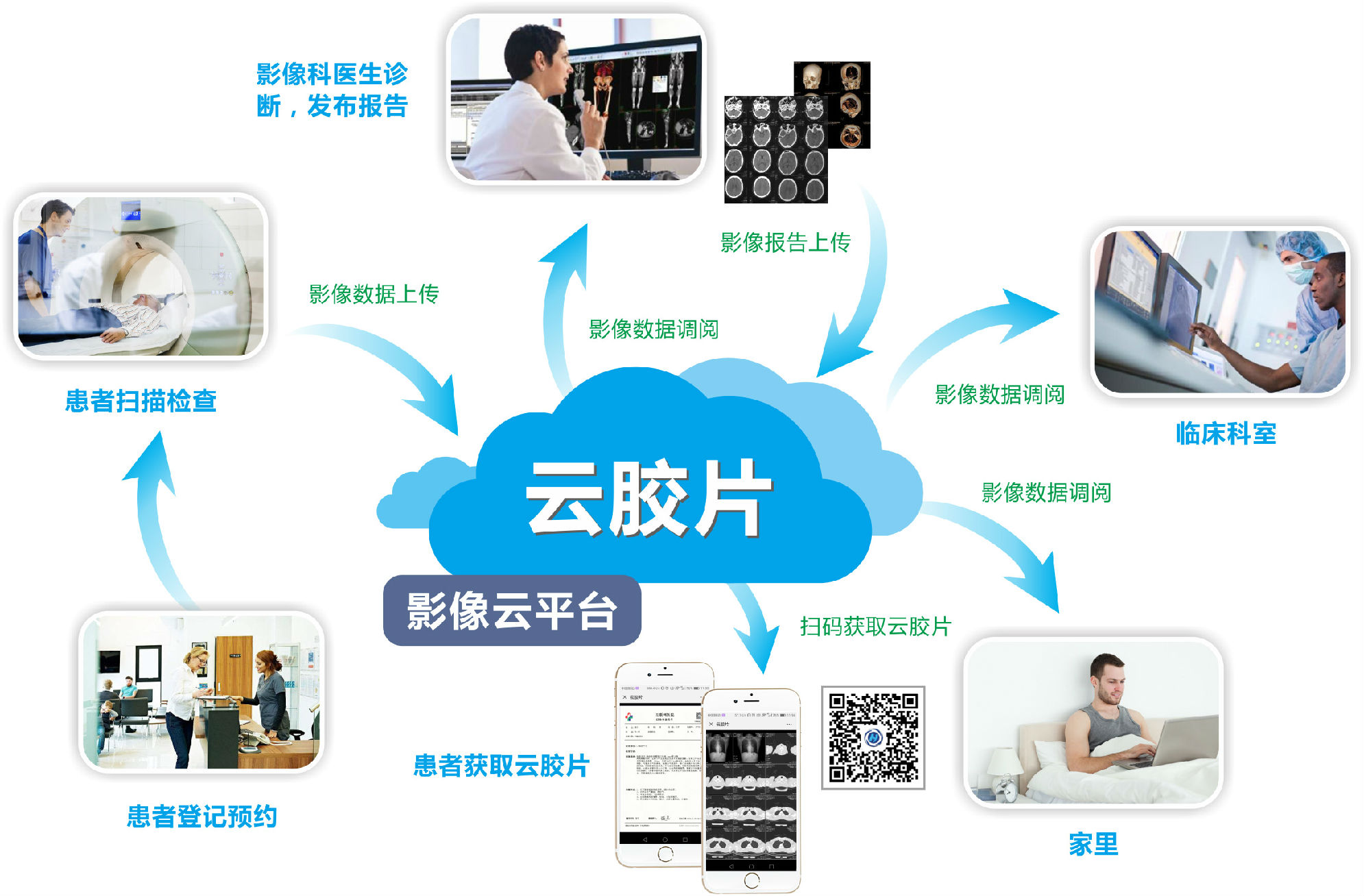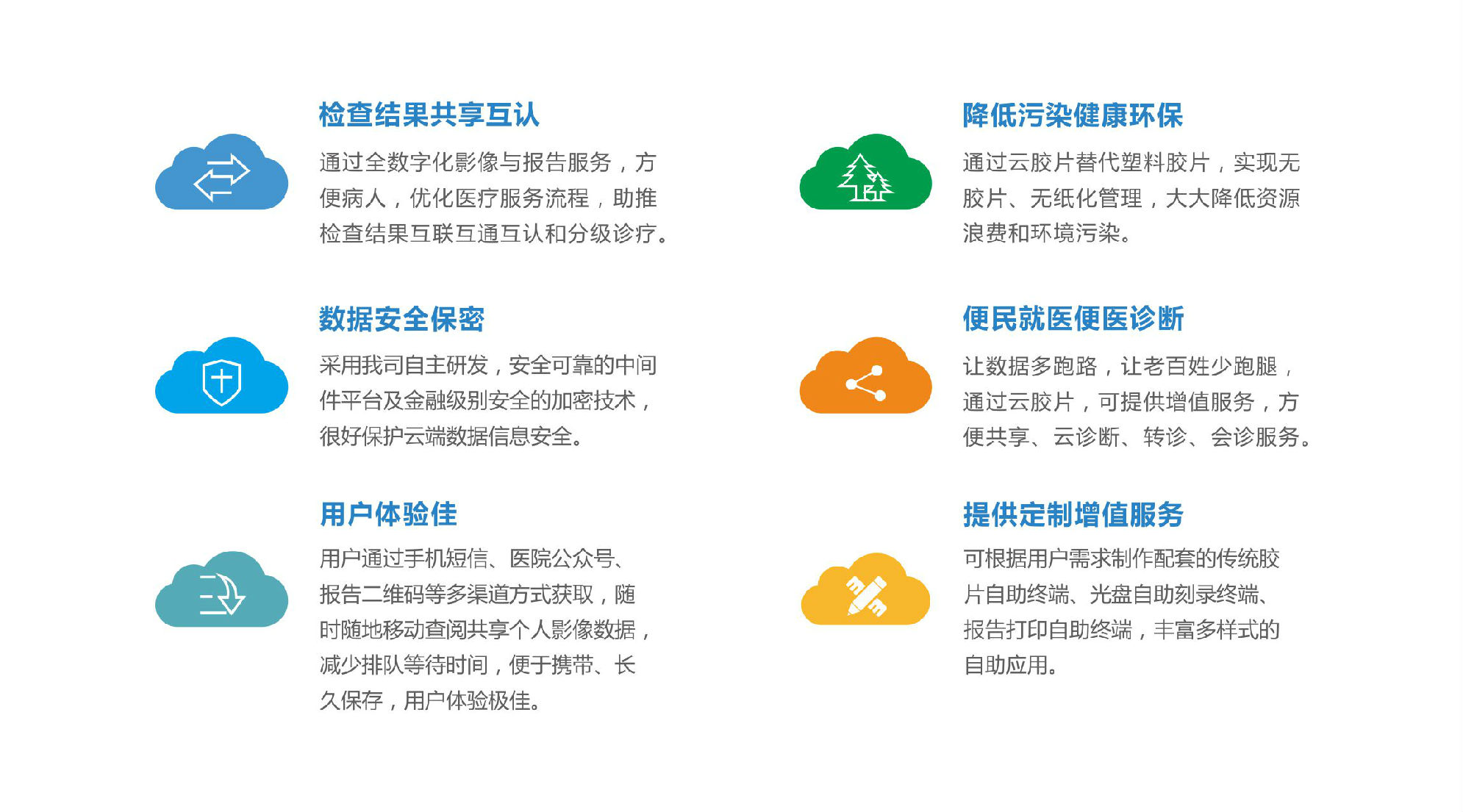 云电子胶片及报告系统,简称“云胶片”。是低碳医疗的最佳典范,是“互联网+医疗健康”的最佳实践,是基于云计算、大数据、人工智能技术,储存在云空间的电子胶片,它具备传统胶片的各项功能,还能实现下载、浏览、打印、分享等数字影像服务功能;影像资料保存在云端,通过安全短消息链接、二维码及其它授权可以随时随地查询和共享影像信息,具有低碳、环保、便捷、经济、互联互通等优势。