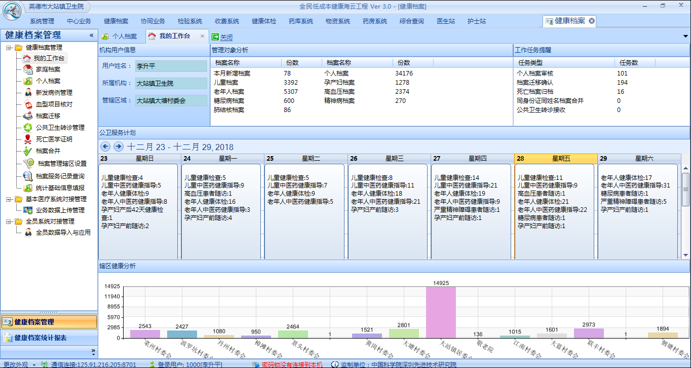 英德市积极贯彻落实不断提升公共卫生业务管理水平;一是首创公共卫生下乡体检管理系统。卫生院公卫人员在下乡为居民群众体检采集的数据,现场即可录入审核,传到数据中心,不用填写纸质后回到医院再重复录入信息系统,大大节省了工作人员的时间和成本;二是建立公共卫生服务资金监审信息系统。各医疗单位完成的工作,直接在系统提供汇总,向审核单位发出审核请求,如中医院负责中医药服务项目,妇计中心负责妇女儿童服务项目,疾控中心负责高血压、糖尿病服务项目,慢病医院负责精神障碍服务项目(并负责向国家平台上传工作)等等,审核完后统一汇总到卫计局财务核算中心,进行最后的结算汇总,输出结算凭证,再向财政局申请政府支付,达到自动化管理,实现政府向医疗机构购买服务的工作目标;