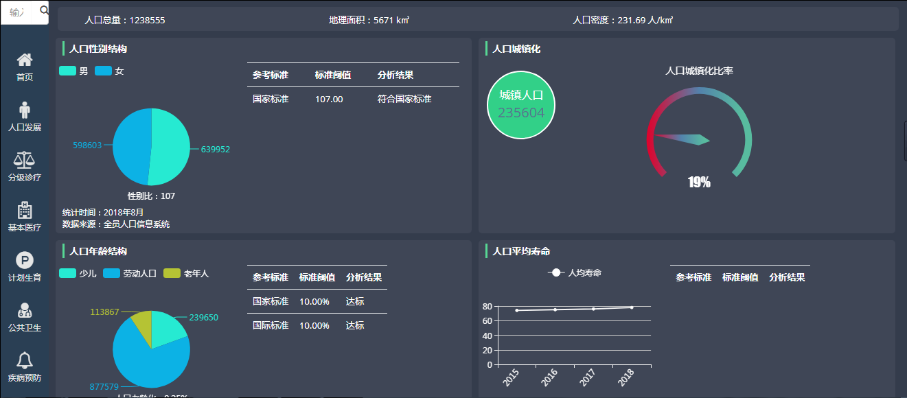 六大模块:包括人口发展、计划生育、基本医疗、监督执法、疾病防控、公共卫生等六大模块的数据分析,为行政部门领导决策提供第一手信息和科学根据。通过对区域范围内医疗健康大数据的分析,帮助医疗卫生部门及时发现辖区内重大疫情等公共卫生风险。