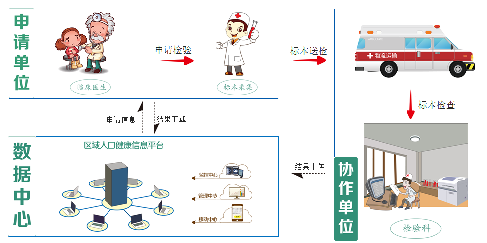 实现英德市人民医院、中医院、妇幼保健院3个临床检验中心对辖管区内的医疗机构的检验诊断和质控;同时也支持检验中心间转检。优化资源,降低成本,减少患者的重复检查,在区域内实现检验结果互认等问题。