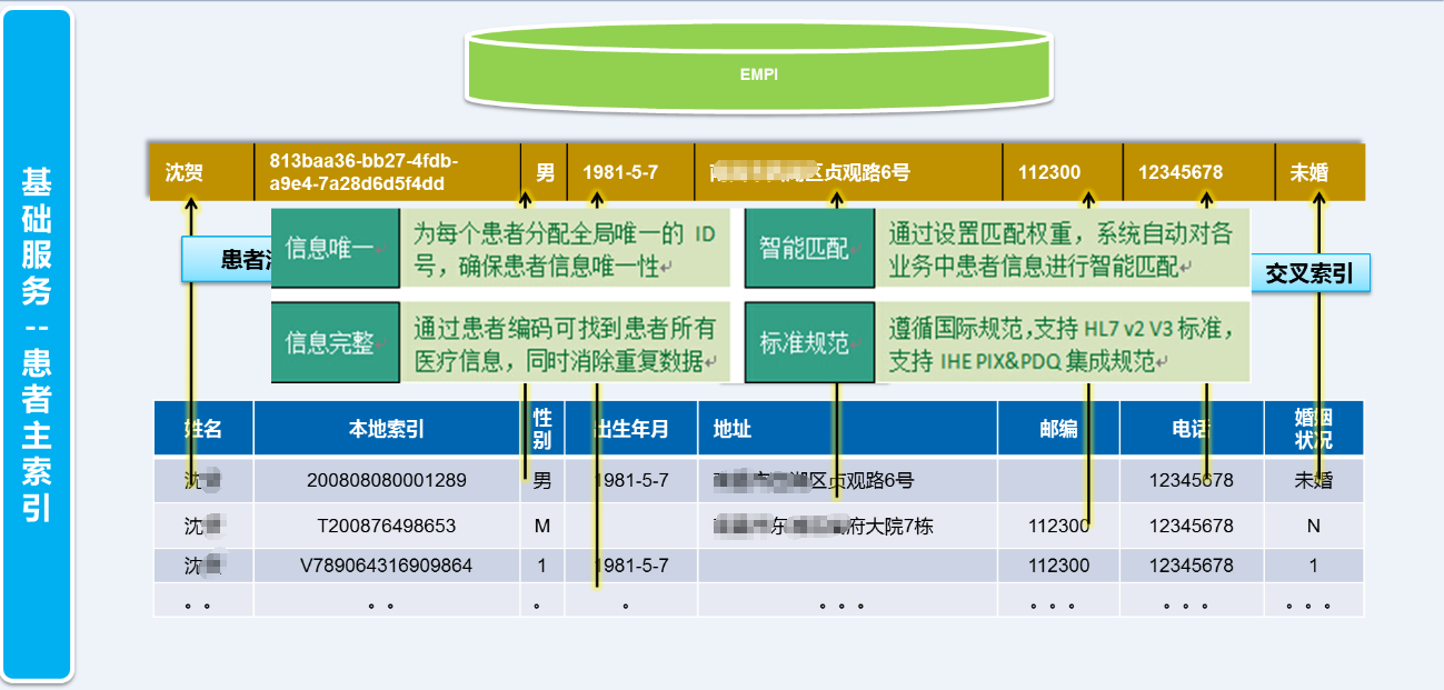 通过维护主索引的规则,识别和整合由MPI创建的主索引信息,并提供人工识别和整合功能。以患者为中心建立主索引(身份证),“一卡在,全区通”。