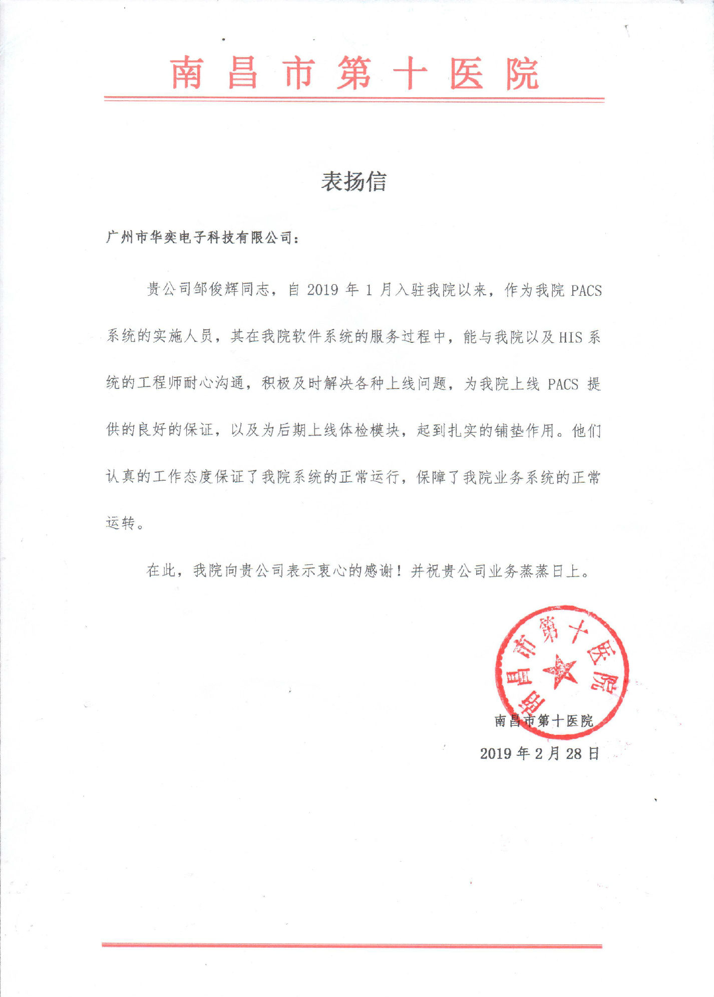 我司南昌市第十医院影像PACS系统项目组员工邹俊辉同事在项目后期的服务过程中表现优秀,得到了医方的一致认可,院方特发文予我司表示感谢与赞扬!
