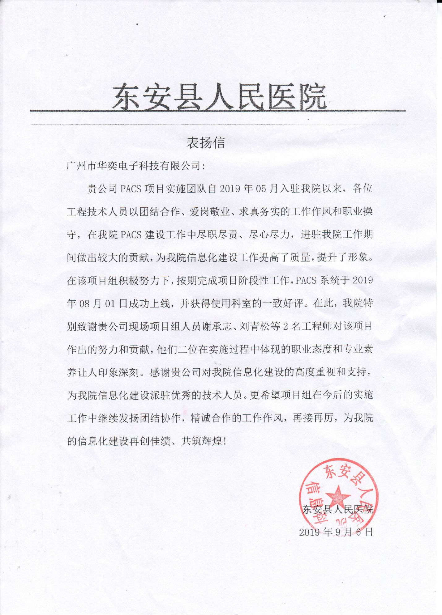 我司东安县人民医院影像PACS系统项目组员工谢承志、刘青松等同事在项目工作过程中表现优秀,得到了院方的一致认可,院方特发文予我司表示感谢与赞扬!