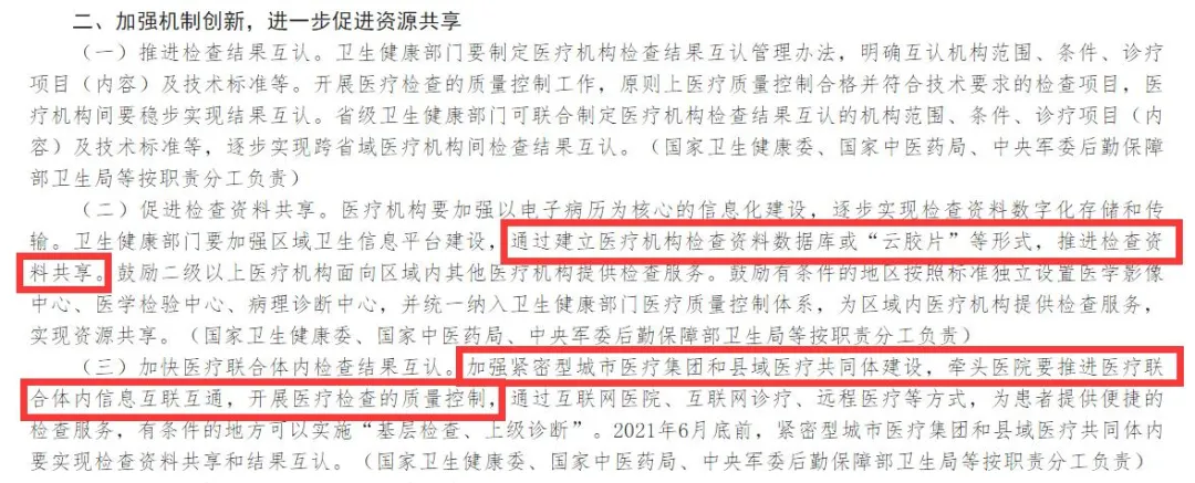 (二)加强医疗行为管理。医务人员应当遵循医学科学规律,遵守有关临床诊疗技术规范和各项操作规范以及医学伦理规范,使用适宜技术和药物,合理诊疗,因病施治。医疗机构要建立大型医用设备检查适宜性点评制度,对检查的适应证、必要性、检查结果阳性率等进行评估并在机构内公示结果。充分发挥药师作用,加强处方审核和点评,重点加强国家监控药物、抗菌药物、抗肿瘤药物、心血管类药物等使用情况监测。强化医疗技术准入、临床路径管理和卫生技术评估,逐步提高临床路径管理的入径率、完成率,降低变异率、退出率。2022年底前,三级医院50%出院患者、二级医院70%出院患者要按照临床路径管理。(国家卫生健康委、国家中医药局、中央军委后勤保障部卫生局等按职责分工负责)(一)推进检查结果互认。卫生健康部门要制定医疗机构检查结果互认管理办法,明确互认机构范围、条件、诊疗项目(内容)及技术标准等。开展医疗检查的质量控制工作,原则上医疗质量控制合格并符合技术要求的检查项目,医疗机构间要稳步实现结果互认。省级卫生健康部门可联合制定医疗机构检查结果互认的机构范围、条件、诊疗项目(内容)及技术标准等,逐步实现跨省域医疗机构间检查结果互认。(国家卫生健康委、国家中医药局、中央军委后勤保障部卫生局等按职责分工负责)(二)促进检查资料共享。医疗机构要加强以电子病历为核心的信息化建设,逐步实现检查资料数字化存储和传输。卫生健康部门要加强区域卫生信息平台建设,通过建立医疗机构检查资料数据库或“云胶片”等形式,推进检查资料共享。鼓励二级以上医疗机构面向区域内其他医疗机构提供检查服务。鼓励有条件的地区按照标准独立设置医学影像中心、医学检验中心、病理诊断中心,并统一纳入卫生健康部门医疗质量控制体系,为区域内医疗机构提供检查服务,实现资源共享。(国家卫生健康委、国家中医药局、中央军委后勤保障部卫生局等按职责分工负责)(三)加快医疗联合体内检查结果互认。加强紧密型城市医疗集团和县域医疗共同体建设,牵头医院要推进医疗联合体内信息互联互通,开展医疗检查的质量控制,通过互联网医院、互联网诊疗、远程医疗等方式,为患者提供便捷的检查服务,有条件的地方可以实施“基层检查、上级诊断”。2021年6月底前,紧密型城市医疗集团和县域医疗共同体内要实现检查资料共享和结果互认。(国家卫生健康委、国家中医药局、中央军委后勤保障部卫生局等按职责分工负责)(一)实施专项治理。开展为期一年的不合理医疗检查专项治理行动,对违法违规行为要依法依规处理。卫生健康部门会同市场监管、医保等有关部门制定工作方案,明确治理重点内容及有关要求,全面组织开展医疗机构自查自纠、地方主管部门监督检查,组织专家采取飞行检查、有因检查、随机抽查等方式进行监督管理,重点整治无依据检查和重复检查。(国家卫生健康委牵头,市场监管总局、国家医保局、国家中医药局、中央军委后勤保障部卫生局参与)(二)加强信息化监测和监控。运用信息化手段对医疗机构检查结果互认和资料共享情况进行实时监测,对高值高频、群众反映突出的检查项目进行实时监控,逐步实现对不合理医疗检查的自动发现、自动提醒、自动干预。对通过监测和监控发现问题突出的医疗机构提出改进要求,促进医疗机构持续提高医疗检查合理性。(国家卫生健康委、国家中医药局、中央军委后勤保障部卫生局等按职责分工负责)(三)建立医疗检查监管长效机制。卫生健康部门要建立日常监督、整改落实的长效机制,将医疗检查纳入医疗服务监管、医疗质量管理、医疗卫生行业综合监督等日常工作。要探索建立重点监控目录和超常预警制度,对费用较高的检查项目和明显不合理的检查行为进行重点监控。要定期通报高值高频检查项目监控情况,将结果与绩效考核、评审评价、评优评先等挂钩,并对不合理检查及时预警并纠正。要建立健全信用评价体系和信息披露制度,加强对纳入医疗保障范围内的医疗检查行为和费用监管,及时查处违法违规行为。(国家卫生健康委、国家医保局、国家中医药局、中央军委后勤保障部卫生局等按职责分工负责)(四)强化责任追究和联动问责。建立违规医疗检查的责任追究和问责机制。对于违反有关规定的医疗机构和人员进行警示、约谈、责令整改、通报批评,情节严重的依法依规追究相关责任。对问题严重、多发或医保违规性质恶劣、涉案金额较大的医疗机构,要严肃追究医疗机构有关负责人领导责任。对医疗机构过度检查问题严重且监管不力的,要追究相关部门负责人的责任。(国家卫生健康委、国家中医药局、中央军委后勤保障部卫生局等按职责分工负责)(一)完善医疗机构绩效分配制度。医疗机构要建立公益性为导向的绩效分配制度,不得设置可能诱导过度检查和过度医疗的指标并将其与医务人员收入挂钩。要借鉴疾病诊断相关分组(DRGs)、以资源为基础的相对价值比率(RBRVS)等方法和经验,将技术水平、疑难系数、工作质量、检查结果阳性率、患者满意度等作为绩效分配重点考核指标,使医务人员收入真正体现劳动价值和技术价值,实现优绩优酬。中医医院要将中医药特色优势发挥情况作为绩效分配重点考核依据,引导
