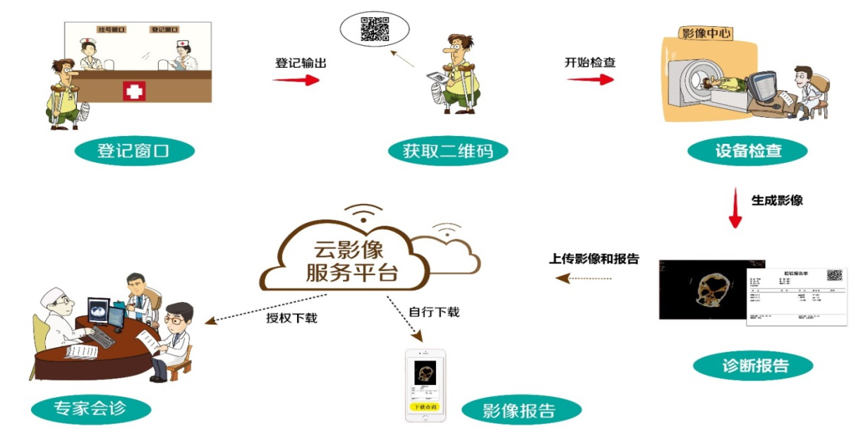 基于互联网影像云平台建立影像远程转检查系统,实现区域内医疗机构影像检查互转,提高设备使用率,病人在区域内任何一家医院都预约到响应医院的检查号,预约成功缴费后,病人到对应医疗机构等候排队检查即可,结果在相应医疗机构可下载打印,实现区域内检查互转。